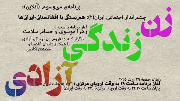 جمعه ۲۹ اوت ۲۰۲۵ در برنامه‌ای با موضوع «چشم‌انداز اجتماعی ایران(۲): هم‌بستگی با افغانستانی-ایرانی‌ها» با