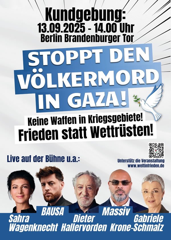Gemeinsam mit den Rappern Massiv und Bausa, mit Peter Maffay, Dieter Hallervorden und Gabriele Krone-Schmalz unterstützen Sahra Wagenknecht und das BSW den Aufruf zur Kundgebung am 13. September um 14 Uhr am Brandenburger Tor.