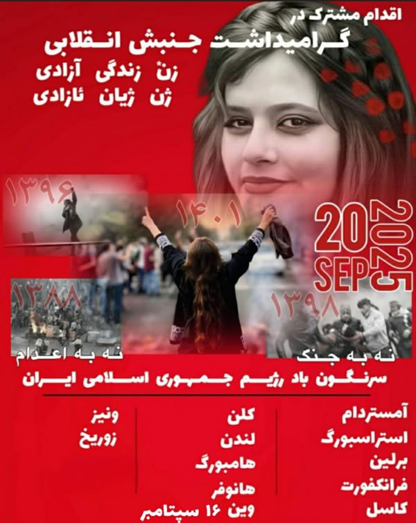 ما، نهادها و کلکتیوهای چپ، دموکرات، فمینیست و کوئیر (ال‌جی‌بی‌تی‌کیو+)، هم‌صدا و همگام در شهرهای آمستردام، استراسبورگ، برلین، زوریخ، فرانکفورت، کاسل، کلن، لندن، ونیز، وین، هامبورگ و هانوفر به خیابان می‌آییم.