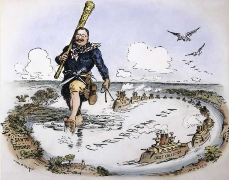 امپریالیسم ایالات متحده در آمریکای لاتین سابقه‌ای طولانی دارد. کارتونی از سال ۱۹۰۴، سیاست «چماق بزرگ» تئودور روزولت را به تصویر می‌کشد