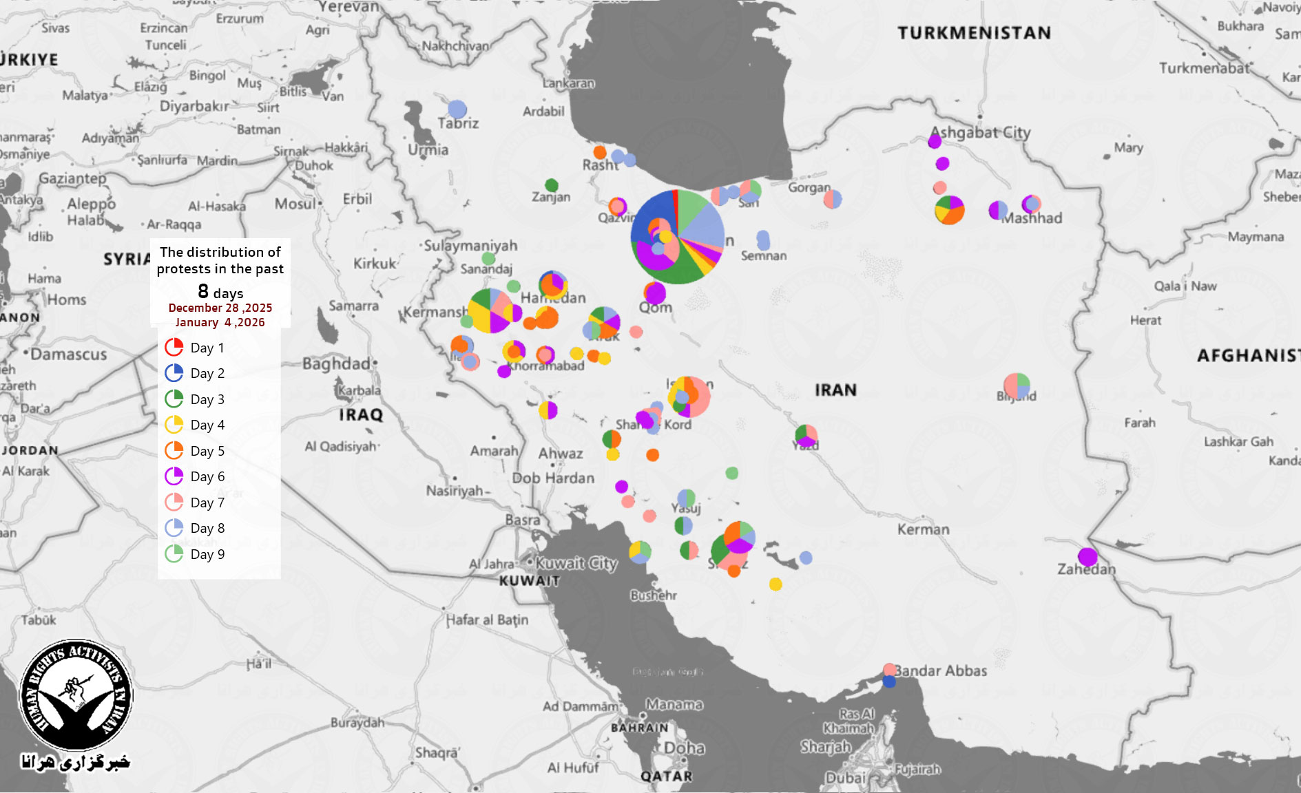 بر پایه اطلاعات به روزرسانی و تجمیع شده خبرگزاری هرانا، ارگان خبری مجموعه فعالان حقوق بشر در ایران، ، طی روزهای اخیر، دستکم ۲۵۷ نقطه در سراسر ایران شاهد شکل گیری اعتراضات، تجمعات خیابانی یا اعتصابات صنفی بوده است. این تحرکات اعتراضی در ۲۷ استان کشور گزارش شده و در همین بازه زمانی، ۱۷ دانشگاه نیز محل بروز کنش های اعتراضی دانشجویان بوده اند.