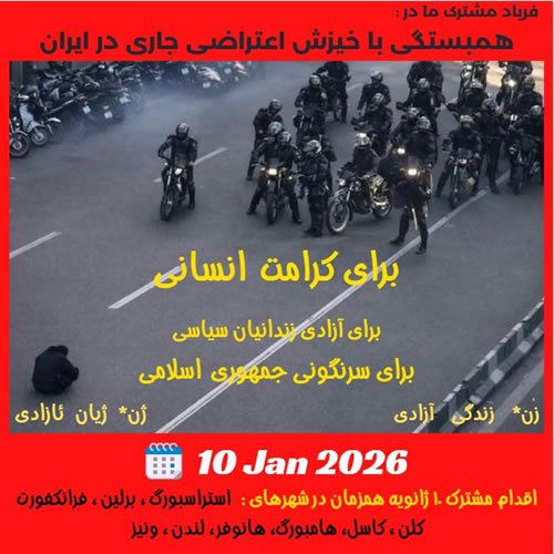 ما، نهادها وکلکتیوهای چپ، دمکرات، فمینیست، کوئیرو (ال جی بی تی کیو +) امضاکننده ی این فراخوان اقدام مشترکی را روز شنبه ۱۰ ژانویه ۲۰۲۶ علیه جمهوری اسلامی ودر همبستگی با مبارزات مردم در ایران ترتیب دادهایم. از همهی انسانهای آزاده میخواهیم که همصدا وهمگام با ما، صدای آزادیخواهانه وبرابریطلبانهی مردم ایران را به گوش جهانیان برسانند.