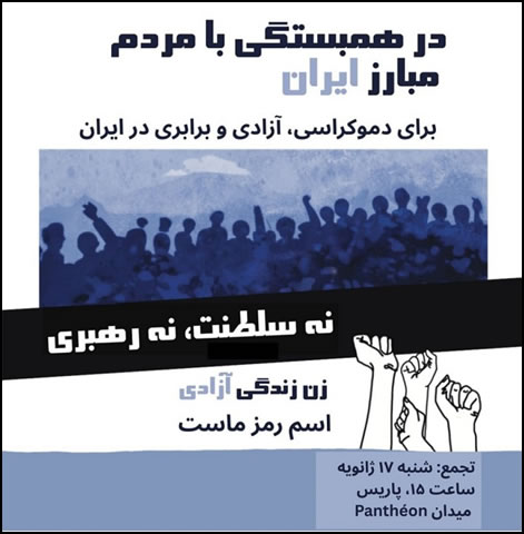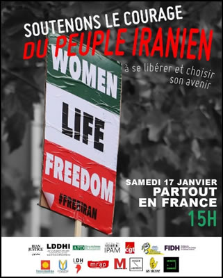 امضاءکنندگان : فمینیستها برای ژینا، لیگ زنان ایرانی برای دموکراسی، انجمن کردهای مقیم فرانسه، آوا، شورای دموکراتیک پاریس (برای حمایت از جنبشهای مردمی در ایران)، همبستگی سوسیالیستی با کارگران ایران