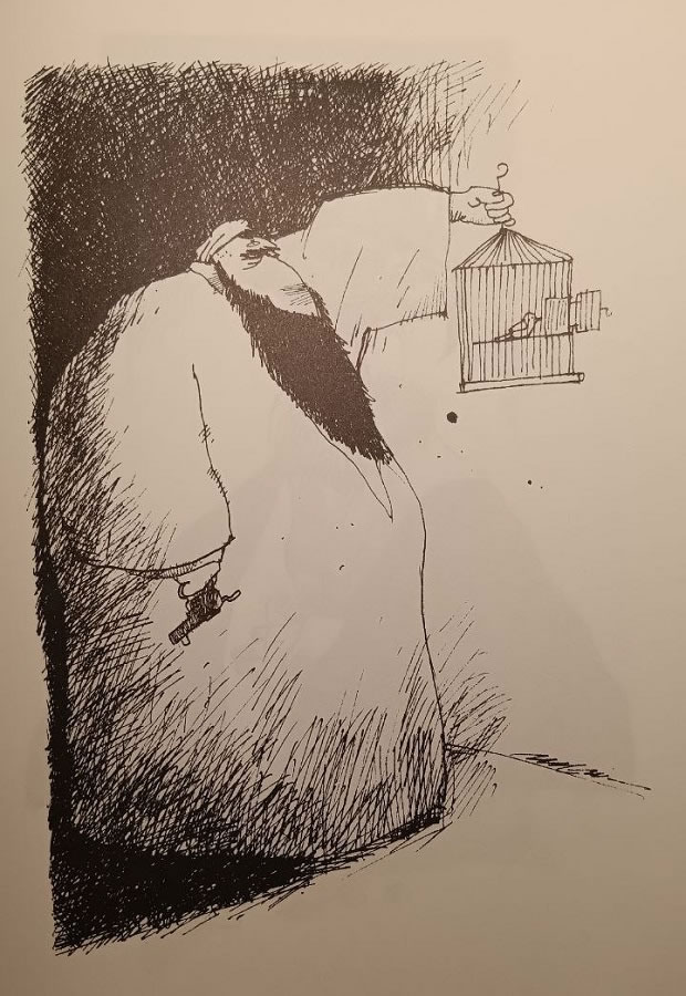 ** تصویر متن: کاریکاتوری از احمد سخاورز، آمده در مجموعه کاریکاتورهایی با عنوان “طراحان ایران- (کاریکاتور)، آثاری از هنرمندان تبعیدیی معاصر ایران” به همتِ دوست ارجمندِ درگذشتهام؛ زنده یاد ایرج هاشمیزاده.