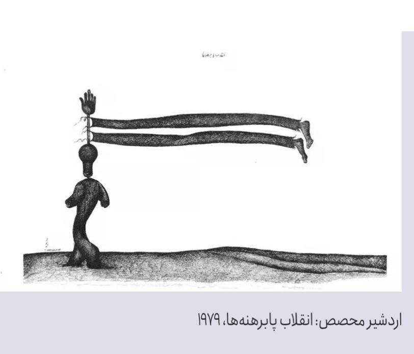 دو پای دراز و بیانتها، بهجای رنگ و نقش بیرق نشستهاند. «پابرهنهها» اینجا پاهایی هستند که راه میروند، راهپیمایی میکنند، له میشوند، کش میآیند، اما هرگز به «سر» نمیرسند. سر همیشه پایین است؛ بیرق بالا با دستی بر فرازش که ژستِ انقلاب است، نه اختیار آن. مثل بسیاری از آثار محصص، زمینه تقریباً خالی است. نه جمعیتی هست، نه افقی روشن. این انقلابی است که تصوری از آینده ندارد؛ انقلابی که درسوی بیجهتی در حرکت است.