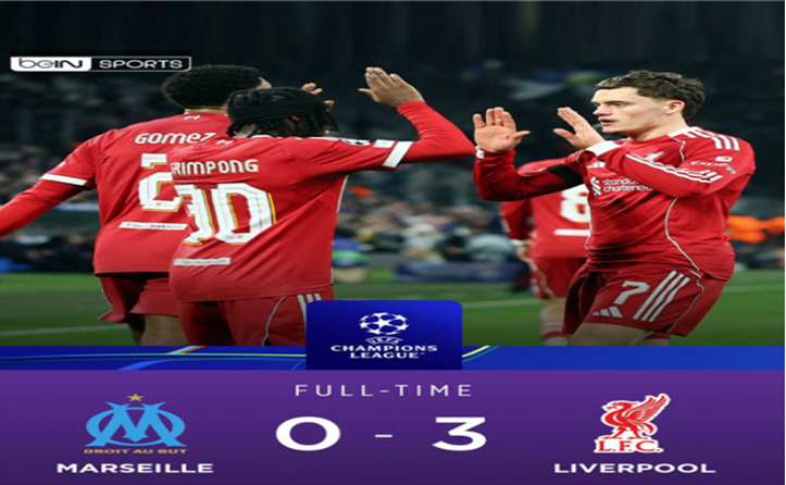 در بازی‌ همزمان؛ لیورپول میهمان مارسی در این شهر بندری فرانسه بود و با ارائه فوتبالی برتر موفق شد شاگردان روبرتو دزربی ایتالیایی را با نتیجه قاطع ۳ بر صفر شکست دهد.