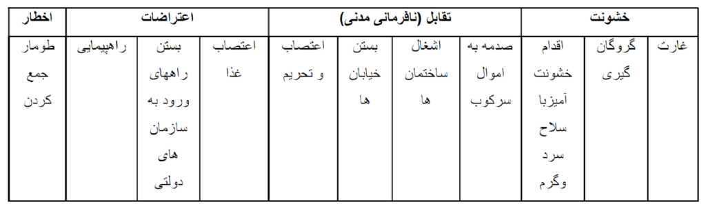در رابطه با رویکرد “نافرمانی مدنی” خشونت و خشونت سیاسی شامل اعمالی مانند: اقدامات خشونت آمیز با سلاح سرد و گرم، گروگانگیری و غارت و… است