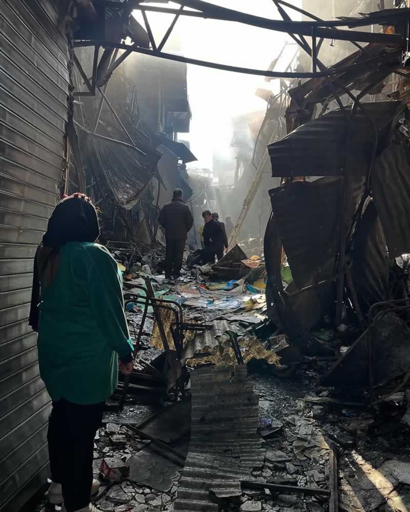 ساعت ۲ بامداد، علی و دوستانش به اطراف بازار برگشتند. به گفته او، چیزی حدود ۵۰۰ مغازه سوخته بود و هنوز شعلههای آتش زبانه میکشید. او وضعیت را شبیه «کابوس» توصیف میکند: «انگار شهر به خاکستر تبدیل میشد.» برخی اجساد از زیر آوار بیرون آورده شده و توی خیابانها افتاده بودند؛ چنان سوخته که قابل شناسایی نبودند. علی میگوید راه شناسایی برای خانوادهها، شاید فقط آزمایش دیانای باشد.