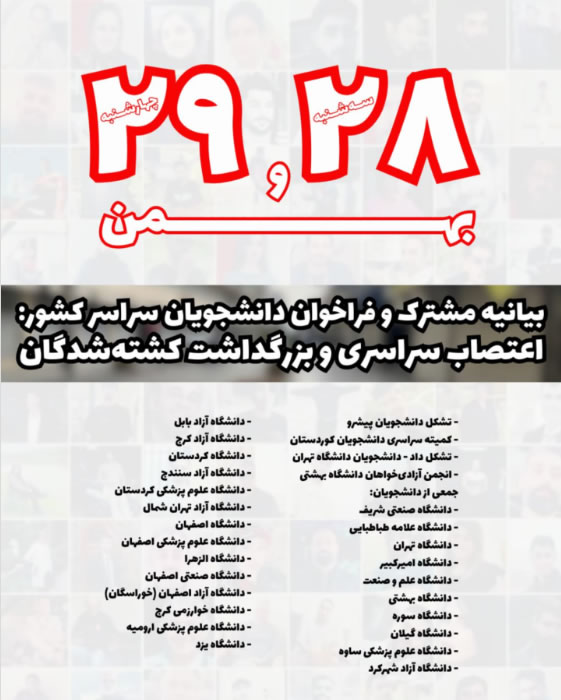 ما دانشجویان سراسر کشور از همهی دانشجویان و مردم آزادیخواه میخواهیم در روزهای سهشنبه ۲۸ و چهارشنبه ۲۹ بهمن، همزمان با چهلمین روز قتل عزیزانمان، با اعتصاب سراسری و تعطیلی محلهای کار و تحصیل، همبستگی خود را با خانوادههای دادخواه بهطور عملی نشان دهند.