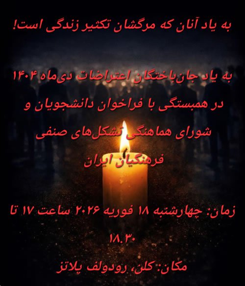 ما نیز به سهم خود، در حمایت از این فراخوان و با گرامی داشت یاد و نام جان باختگان اعتراض های اخیر در روزهای سه شنبه و چهار شنبه ۱۷ و ۱۸ فوریه، در میدان های اصلی شهر های مختلف جهان گرد هم می آییم و هم صدا و در حمایت از فراخوان دانشجویان و همه ی کسانی که به این اعتصاب پیوستند، صدای مردم ایران خواهیم شد.